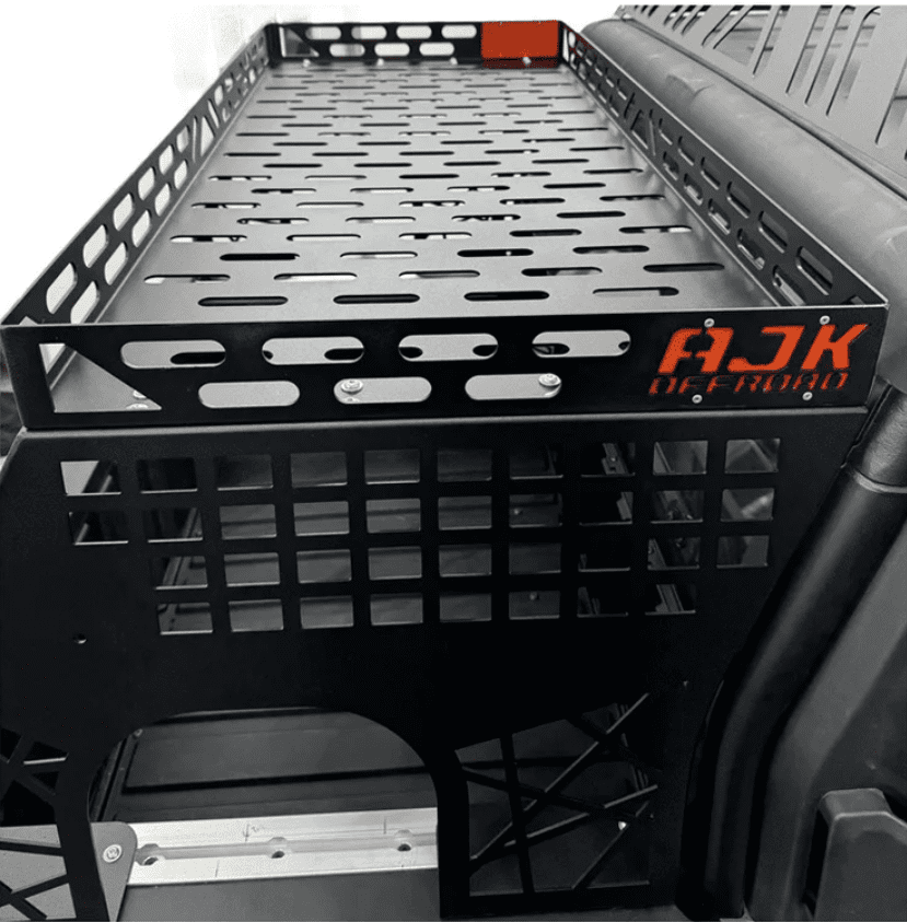 It mounts on the bed rails, sitting slightly lower than the roof, providing extra room for long weekend getaways. The rack features moly panel holes and mounts for a rotopax. Constructed from .125 thick aluminum and powder-coated in a mild textured black, it has a rigid 3-piece design.