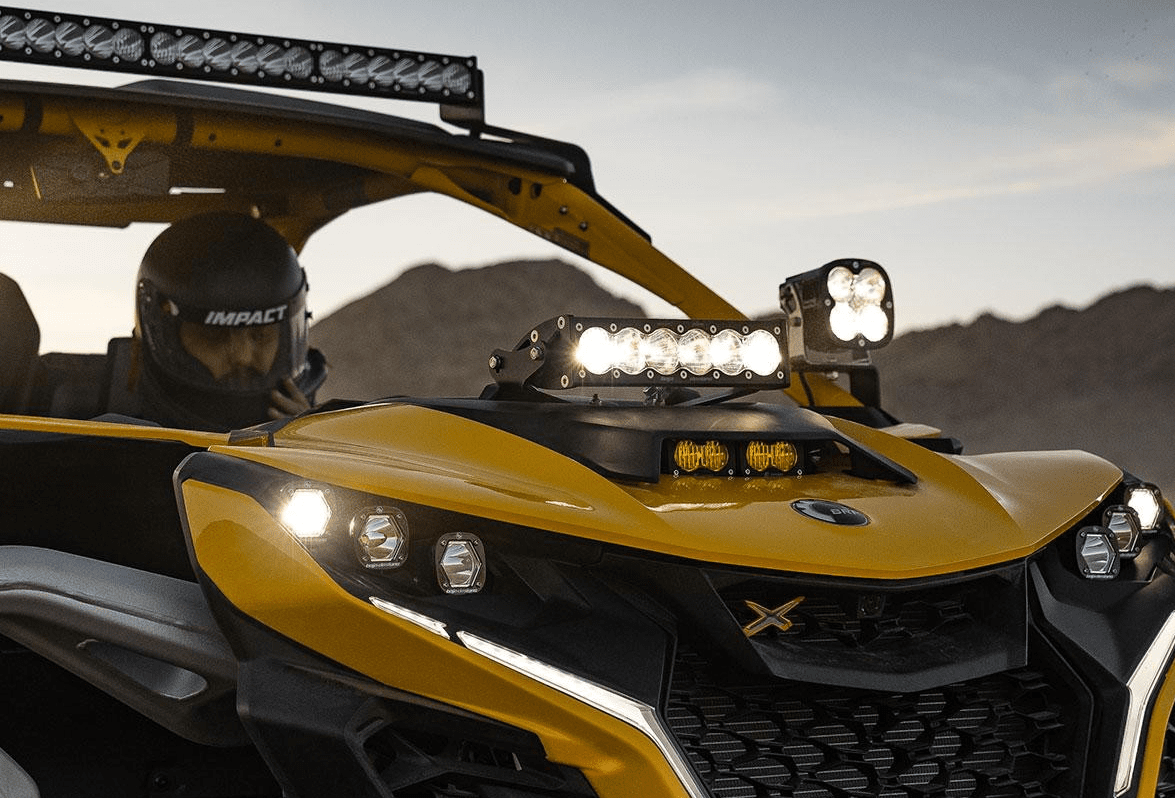 Elevate your Can-Am Maverick R with the Baja Designs OnX6+ 10 Shock Tower Kit, featuring a sleek low-profile design.