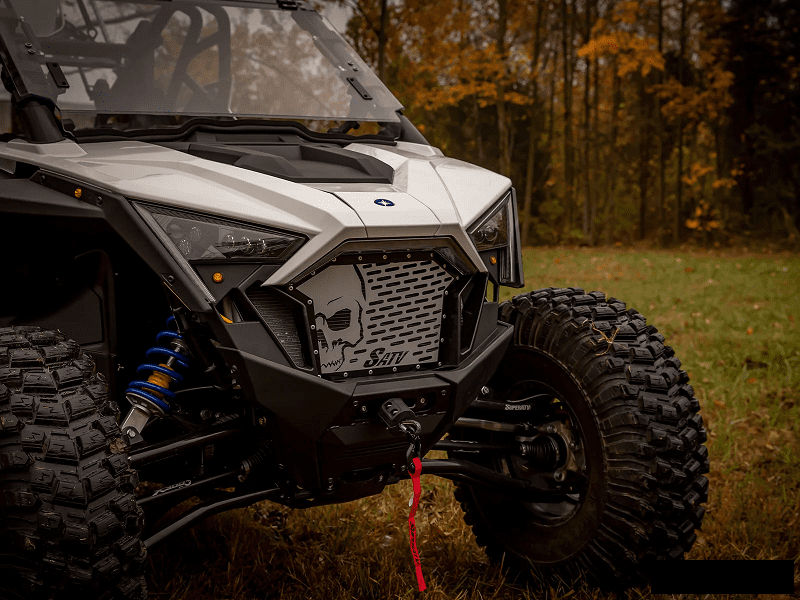 The Super ATV Skull Style Grille Insert transforms your Polaris RZR PRO XP into a standout machine with its striking gray skull design and black riveted frame.