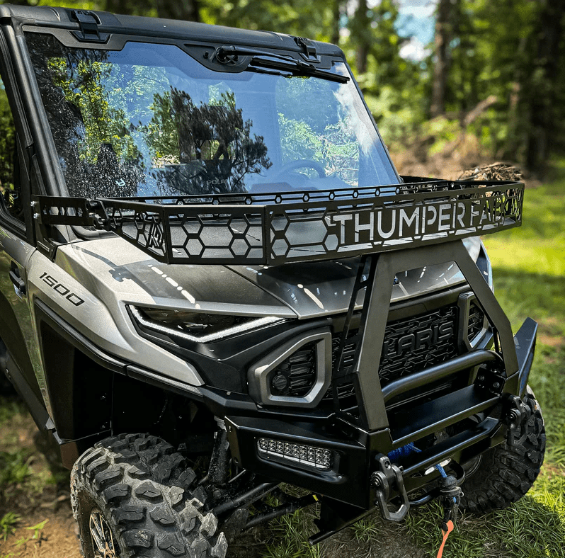 Enhance your Polaris Ranger 1500 XD with the Thumper Fab Hood Rack, designed for both the Ranger 1500 OEM bumper and the Thumper Bumper with Bull Bar.