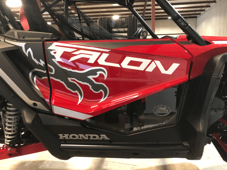 Trail Armor's Door Inserts for the 2019-2022 Honda Talon 1000X, Talon 1000R, and 2021-2022 Talon 1000R Fox Live Valve are available in two materials: 1/4" polycarbonate with a mar-resistant coating or solid black plastic.